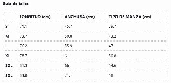 - Doble costura en mangas y dobladillo inferior para mayor durabilidad.